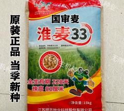 淮麦33是中国江苏徐淮地区淮阴农业科技研究所选育的中晚熟半冬性品种,由烟农19为母本和郑麦991为父本杂交选育而成。淮麦33幼苗半匍匐,叶色深绿,前期长势较快,株形紧凑,叶片较小;穗近长方形,长芒、白壳、白粒,籽粒硬质、饱满;有效穗数620万穗/公顷,每穗粒数36粒,千粒重41克,容重843克/升左右。