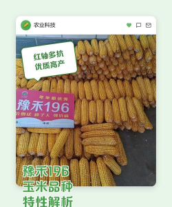 豫禾196株高279.89cm,株型紧凑,筒型的果穗,穗长17.5厘米,穗行数16-18行,红色的穗轴,黄色籽粒,形状为马齿型,百粒重34.8g,籽粒容重为742g/L。该品种在黄淮海夏玉米组从出苗至成熟通常需要100.9天,高感弯孢叶斑病和南方锈病,中抗粗缩病。