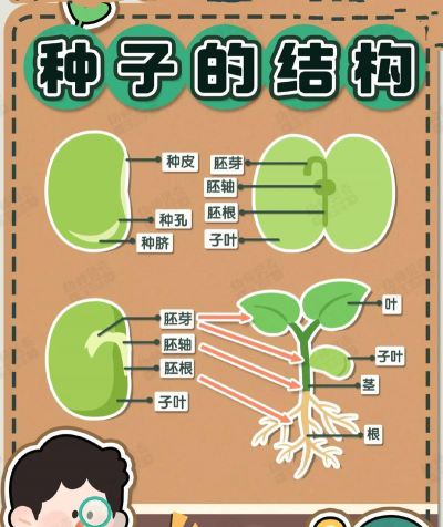 不同植物所产生的种子在大小、形状颜色、彩纹和内部结构等方面有着较大的差异。如椰子的种子很大,其直径可达15~20 cm,而油菜、梦卜芝麻的种子则较小,烟草和兰花的种子则更小,犹如微细的沙粒;大豆、菜豆的种子为肾形.油菜、豌豆的种子为圆球形,蚕豆的种子为扁形,花生的种子为椭圆形;种子的颜色也各有不同,有纯为色的,如黄色、青色褐色白色或黑色等,也有具彩纹的,如蓖麻的种子。