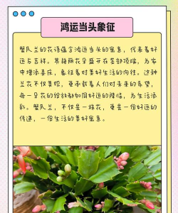 蟹爪兰(又名圣诞仙人掌、蟹爪莲)是一种寓意丰富且象征意义多样的观赏植物,其花语和寓意主要围绕好运、喜庆、热情以及事业与生活的积极转变展开。以下是综合各来源的详细解读: