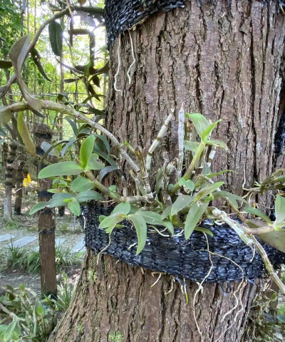石斛在树上种植是一种仿野生的栽培方式,主要利用树木的树干或粗枝作为附主,模拟其自然生长环境。以下是具体的种植方法和技术要点: