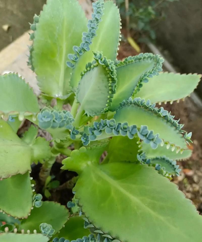特点:叶片边缘的圆齿处会自然长出小芽(不定芽),这些小芽成熟后脱落并落地生根,形成新植株,因此得名“落地生根”或“不死鸟”。
