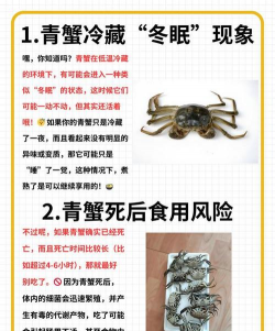 如在常温状态下死亡,超过2小时一般就不建议食用;在冷冻状态下死亡,超过3个月就不建议食用。螃蟹中含有丰富的蛋白质、维生素D、钙、磷、钾、钠、镁、硒等营养物质,对身体健康有益。但螃蟹主要以动物尸体及腐烂食物为主,螃蟹一旦死后,其体内细菌就会大量繁殖,进而产生对人体有害的毒素。