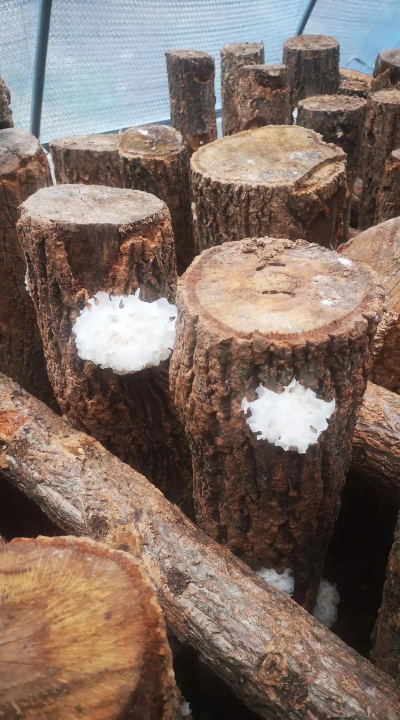 3-5天后可见白色羽毛状菌丝(香灰菌丝)植入木材