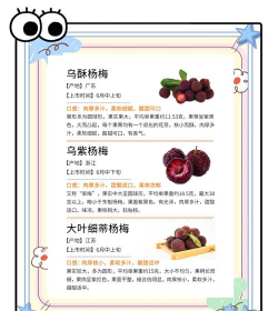 晚稻杨梅:晚稻杨梅属于杨梅科杨梅属植物,果实圆球形,完熟时紫黑色,充分成熟时近黑色。肉柱圆钝肥大,果顶微凹,果基圆形,果柄短,肉质细,汁多,甜酸适口,香气浓郁,核肉易分离。鲜食肉质细腻,甜浓带酸,香气浓郁,品质优异,鲜果食用品质极佳。
