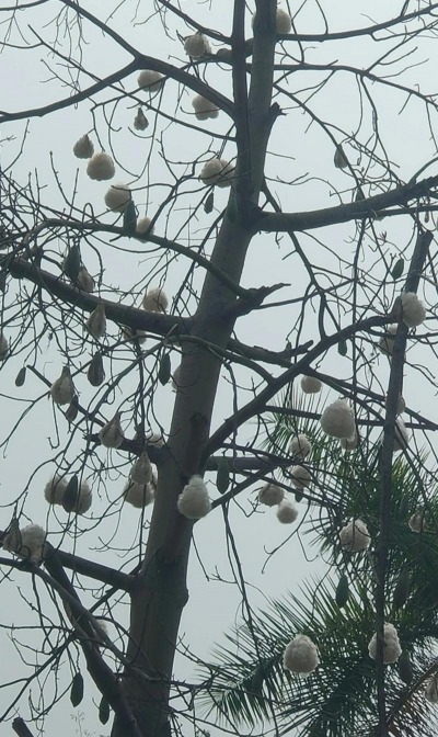 棉花长在树上。棉花原产于亚热带,是锦葵科棉属植物的种籽纤维。植株灌木状,在热带地区栽培可长到6米高,一般为1至2米。花朵乳白色,开花后不久转成深红色然后凋谢,留下绿色小型的蒴果,称为棉铃。棉铃内有棉籽,棉籽上的茸毛从棉籽表皮长出,塞满棉铃内部,棉铃成熟时裂开,露出柔软的纤维。