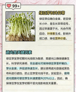 绿豆芽长叶子了还能吃。绿豆芽就是绿豆经过浸泡后生发的嫩芽,食用部分主要是下胚轴。绿豆在阳光下生芽较快,很容易长出绿叶,这是一种光合作用。绿豆芽在中国芽菜消费中占比最大,口感好,营养丰富。
