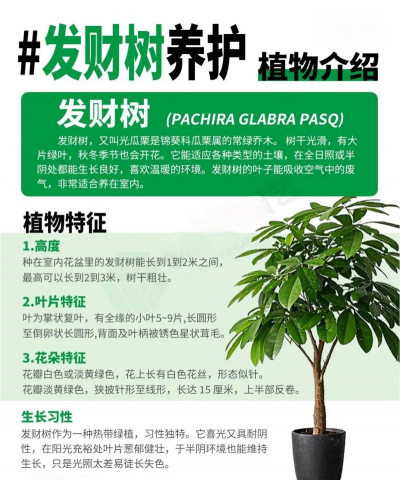 1、温度:发财树不耐寒,最适宜的生长温度在16-26℃之间。夏季温度比较高,应将植株放在温度稍微低一些的位置。冬季需要适当的提升温度。