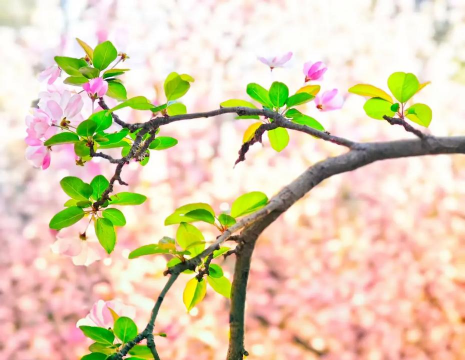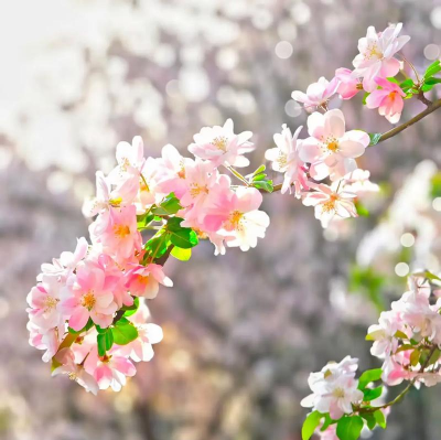 海棠:包括垂丝海棠(花朵下垂)、西府海棠(花朵朝上)、贴梗海棠(无花柄),花期3-5月,花姿娇媚。