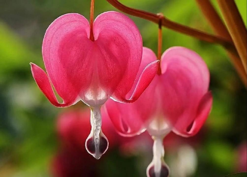 花朵呈心形或铃状,外层花瓣粉红色或玫红色,基部膨大如荷包,内层花瓣细长呈白色,整体形似古代荷包或滴血的心,因此得名“荷包牡丹”。