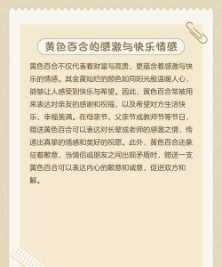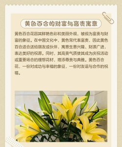 黄百合的花语是歉意、感激、快乐,寓意着招财进宝、财富、高贵和荣誉。黄色是一种十分明亮活泼的颜色,而百合花的花姿优美,能够给人一种高雅的感觉,并且百合花的花朵直立向上盛开,仿佛一个意气风发的人,适合赠送给朋友,以此表示对他的肯定;可以送工作中的好伙伴黄百合,祝愿他们的仕途一帆风顺;还可以送给生病的人,祈求对方身体健康。