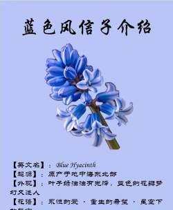 蓝色风信子的花语是高贵、胜利、爱慕、浓郁、贞操、生命、恒心、倾慕、幸福,象征着生机勃勃,也是是幸福的象征,还有纯洁无暇的意思。蓝色是风信子最原始的颜色,比较多见。蓝色的风信子也可送给自己的爱人,或者是有高雅,高贵气质的人。送给恋人表达的意思是对两人感情的恒心。送给有气质的人,表示对对方的赞美。