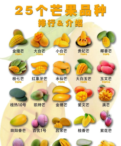 芒果品种有水仙芒、苹果芒、鹰嘴芒、青皮芒、金煌芒、贵妃芒、台农芒、凯特芒、辣椒芒等。芒果在我国有40多个品种,在全世界已经有百余个品种。芒果为热带水果,通常为长圆形或长圆状披针形,汁多味美,可制罐头和果酱或盐渍供调味,也可以酿酒。