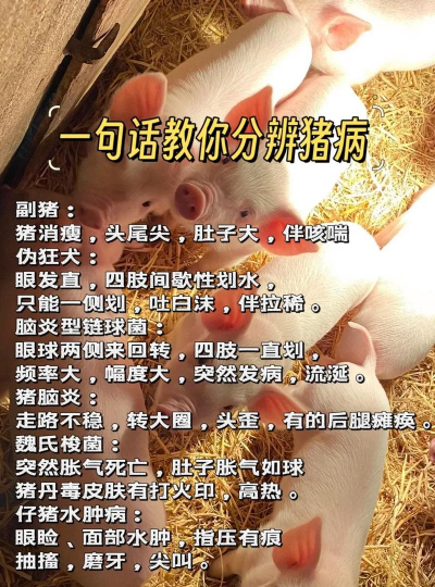 环境调控:夏季注意降温防热应激,冬季避免潮湿引发呼吸道疾病。通过以上多维度观察和检测,可快速锁定疑似疾病范围,并结合实验室检测进一步确诊。日常饲养中需定期巡查,记录猪群健康状态,以便及时应对。