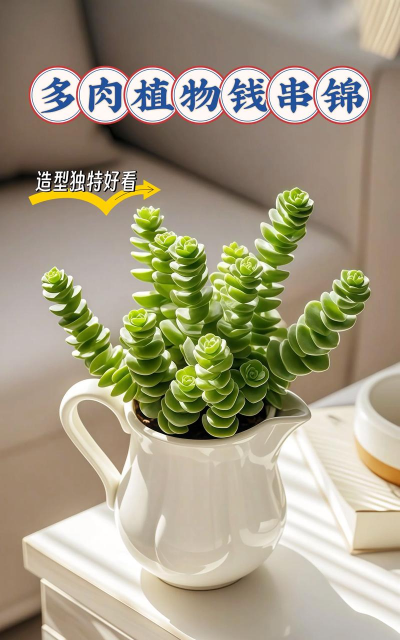钱串属于冬型种的多肉,凉爽季节生长,高温季节休眠,所以冬天正好是它生长的时候,所以大家要把它放在南阳台或南窗台上,保证充足的光照,如果光照不足,会导致叶片松散,甚至徒长。