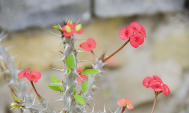 虎刺梅(铁海棠)枝干带刺且汁液有毒,但开花时红色花朵密集,花期长,适合盆栽或刺篱,需注意避免接触其乳汁。
