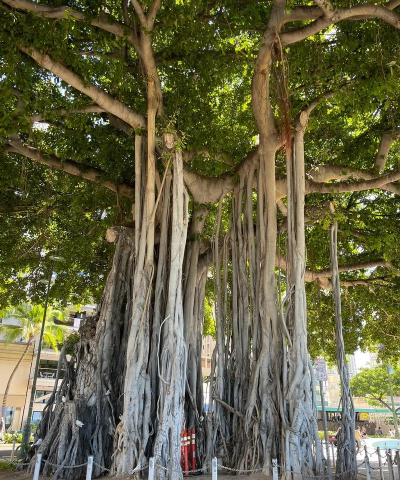 根系如同千手观音般伸展,庇护着过往的行人,传递出一种守护与庇佑的意象。