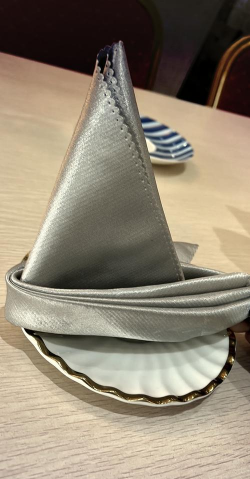 扇面扇形折叠法制作的餐巾花,简洁大方,常用于中式婚宴,象征团圆美满。