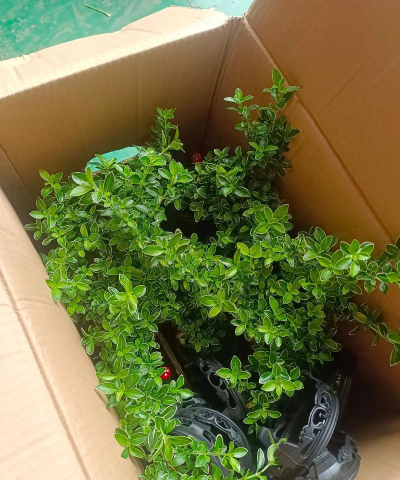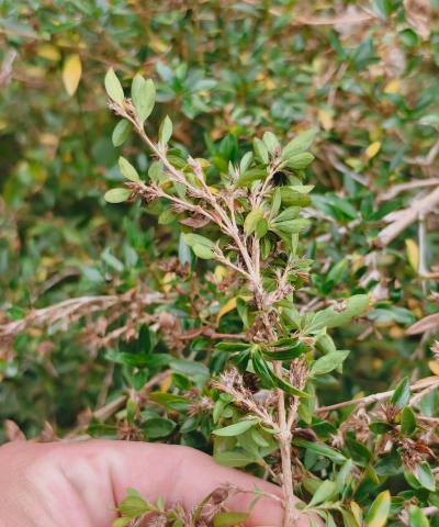 白马骨叶片极小,形状为卵圆形,叶片颜色一般全为绿色,少数有绿色上面镶嵌乳白色的品种。