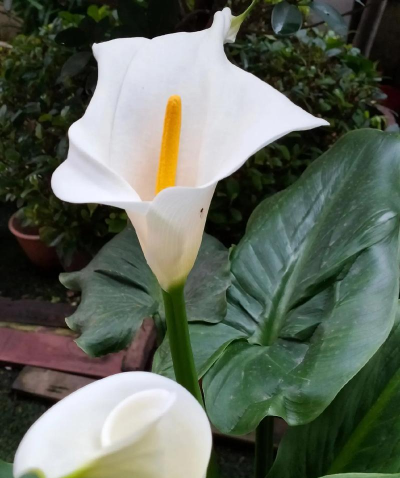 马蹄莲块茎不规则,佛焰状花苞搭配黄色花蕊,喜潮湿环境,适合水边或盆栽养护。
