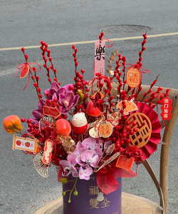 福桶花通常由多种具有吉祥寓意的花材组合而成,既包含仿真花也包含鲜切花,主要用于春节等节日装饰,象征福气、财富和好运。以下是常见的福桶花种类及其寓意: