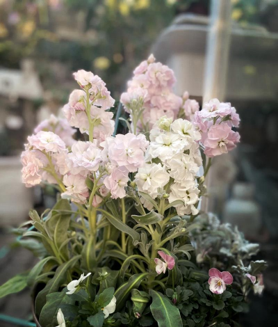 紫罗兰,花朵茂盛,花色鲜艳,香气浓郁,花期长,花序也长,适宜于盆栽观赏,常用于布置花坛、台阶、花径,整株花朵可作为花束。另外,紫罗兰不是兰花。