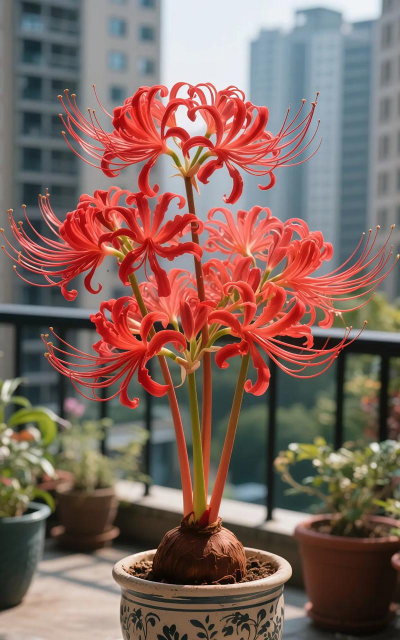 朱顶红球根花卉,花大色艳,室内外皆宜。栽种时露出球体,先开花后长叶,冬季室内养护可开花。