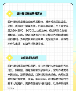 基质选择:棕榈在酸性或者微碱性土壤中都可生长,土壤要排水性良好、湿润肥沃。温度管理:养殖温度可在22-30℃左右,不要比15℃低,也不要高于35℃。水分管理:它很喜欢湿润,可以每周给它浇水一次,冬天可以10天浇一次水。光照管理:要多光但不要被暴晒,也可在半阴处养。