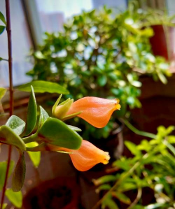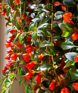 金鱼吊兰又名金鱼花、袋鼠吊兰,是半木质化的花,叶片呈深绿色,比较厚,花是橘黄色的,有小小的嘴和大大的肚子,外形酷似小金鱼,深受喜爱。