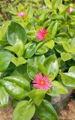 3、它是多年生常绿多汁的植物。枝条长度约20厘米,肉比较多,长得鲜绿。这些树枝是有棱角的,拉长了就是半趴着的样子。顶部开花,开花后分枝。花的颜色是深红,中间是淡黄的,形状跟菊花大体相似,小花瓣,有光泽,从春天到秋天开放。