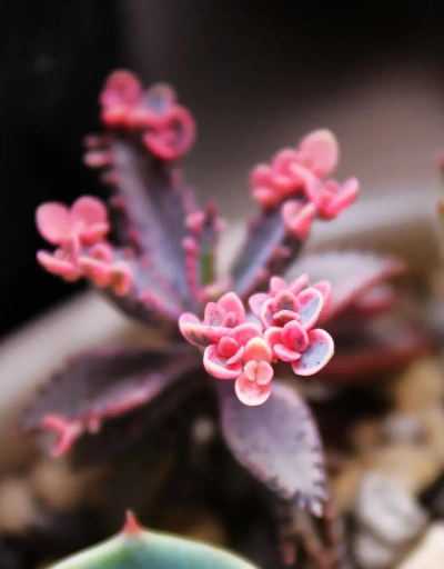 不死鸟就是名副其实的不死花,叶子边上长满了圆圆的牙齿,看起来萌萌哒吗,圆齿很容易就会发芽,小芽长大了接触到土壤就能长成一棵新的不死鸟,这繁殖速度杠杠滴!