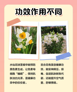 水仙花鳞茎外包裹棕褐色皮膜;百合花的鳞茎外面没有皮。叶子不同:水仙花叶子比较扁平,颜色为朦胧的绿色;百合花叶子形状为狭线形,颜色比较的深。花朵不同:水仙花的花型比较小,整体颜色是纯白色,中间有黄色;百合花花型比较大,颜色大多是白色的,只有花蕊是黄色的。