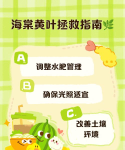 海棠花出现黄叶有很多原因。若是阳光太强导致的,需要先剪掉黄叶,然后把它改放到一个通风处,进行养护。若是土壤积水导致的,需要将它从土中取出来,剪除黄叶和烂根,再用排水性好的新土重新种植。若是施肥过量导致的,需要将它脱盆,清洗根系后栽种到新土中养护。