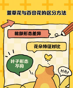 根部不同:萱草是属于宿根花卉,有较短的根状茎和粗壮的肉质根,形状是纺锤状;百合花属于球根植物,鳞茎是球型的,颜色为淡白色。花朵不同:萱草花朵比较小,开花的间距较小,花色是橙黄色的;百合花花朵比较的大,形状为漏斗形,每朵花的间距也很大,花色一般是白色的。