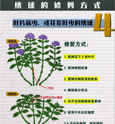 绣球最好等到所有的花朵都开败以后再去修剪,这样修剪后新枝再长出来,就能一样的整齐,来年开花后观赏效果更好。如果每开完一朵花就去修剪一次,那么后期枝条会长得高低不平,受光也均衡,下次开花还是有早有晚。所以还是建议等到所有的花朵都开完以后再去统一修剪,这样植株长得更整齐有形。