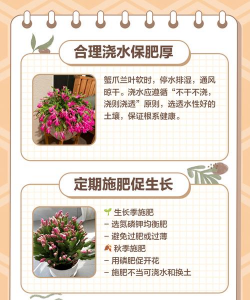 1、浇水:春秋季可以两三天浇一次水,夏季可以一两天浇一次水,冬季则四五天浇一次水。2、光照:可以将它养护有一定散射光的地方,夏季注意遮阴。3、温度:蟹爪兰适宜在十五到三十二度左右的环境中生长,室内养殖时只要温度不要过高或过低即可。4、施肥: