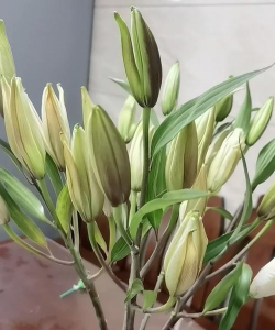 想让买回来的百合花开花,要对花枝进行修剪,使用消毒后的剪刀,将花枝斜剪,增大茎秆的吸水面积,然后将其插入干净的细长花瓶中,并向其中倒入无污染的水分,让水面到达茎秆三分之一的位置即可。