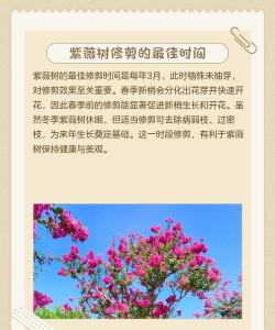 紫薇的修剪一般在春季的早期就开始进行,时间从三月份开始,接近四月份。具体的修剪时间取决于植物的生长,比如当叶子长出来,枝干也开始活跃的时候,就可以开始修剪。