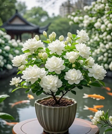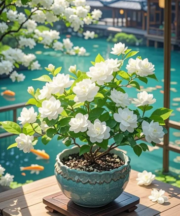 茉莉花花朵小巧洁白,香气清新持久,花期从春到秋,尤其适合温暖环境。可盆栽养护,需充足光照和定期修剪以促进开花。