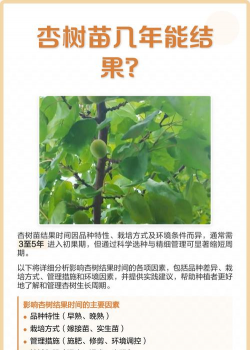 杏树一般四年结果,有一句谚语是"桃三杏四梨五年,枣树当年就卖钱",可以看出杏树四年就会开花结果,后期结果量更大,在第五年就能进入到盛果期。移栽杏树的话,一般2-3年就会开始结果,嫁接苗在第二年就能结果。杏树的品种不同,开花结果时间也不同,比如金太阳结果早,第四年就能达到丰产期。