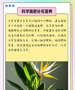 在盛夏季节养护天堂鸟时,需要定期喷洒除菌药剂,防治病虫害,也需要在光照过于强烈的时候,为天堂鸟做好遮阴措施,可以使用遮阳网覆盖在植株上方,避免天堂鸟被晒伤,还需要向天堂鸟的叶片上喷洒磷酸二氢钾,使其叶片更为翠绿。