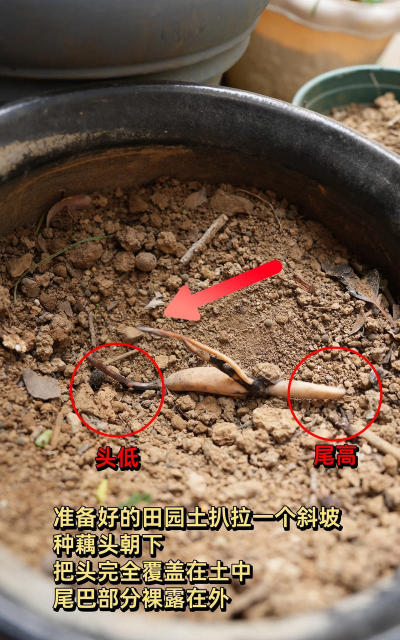 填土与水位:容器内填入土壤至1/2-2/3高度,加水搅拌成泥浆状,水位初期保持5-10厘米。种藕平放或斜插(顶芽向下,尾端露出土面),采用“藏头露尾”方式。
