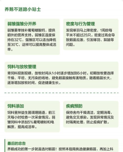 密度与分群:1-7日龄每平方米25只,随日龄增长逐渐降低密度。按强弱分群,每群不超过200只,避免挤压和争食。