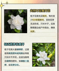 栀子花属于喜阳植物,对光照的需求较大,如果长期处于弱光、阴暗的环境中,植株无法进行光合作用,自然也不会开花,此时要将栀子花移入阳光下,每天提供5-6小时的光照,让植株开出美丽的花朵。