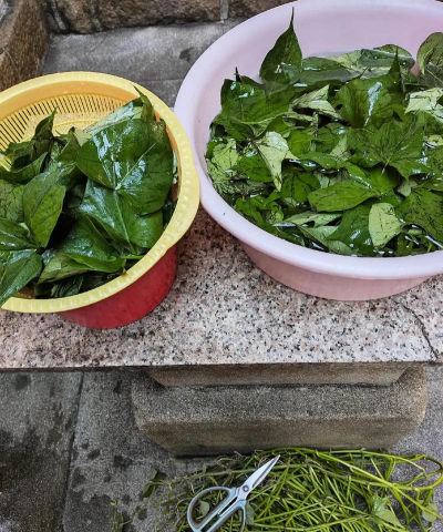 1.红薯叶馒头:红薯叶洗净控水,切碎(不用特别碎,用刀来回切几下就好),放入发好的面盆中,加少许盐,一起揉进面中。