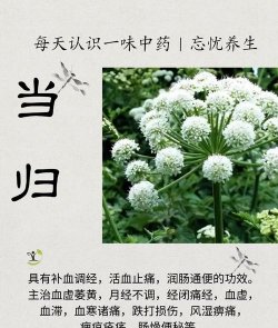 当归是伞形科当归属多年生草本植物。根圆柱状,分枝,黄棕色;茎直立,绿白色或带紫色,有纵深沟纹;叶羽状分裂,紫色或绿色,卵形;花白色,花柄密被细柔毛,花瓣长卵形,花柱基圆锥形,花期6-7月。果实椭圆至卵形,翅边缘淡紫色,果期7-9月。《本草纲目》中记载:“古人娶妻,为嗣续也。当归调血,为女人要药,有思夫之意,故有当归之名。