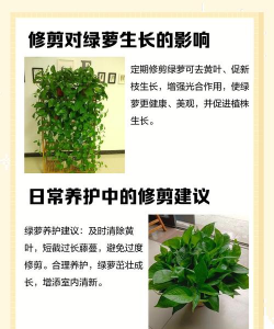 绿萝在盆栽的过程中,应该在花盆中间设立一根支柱,以便于藤蔓缠绕向上生长,当兰生长至20厘米时,将茎梢顶端截短一部分,对于冬季受冻或下半部脱叶的绿萝,可以把一半的茎短截1/2,促进新叶的萌发。