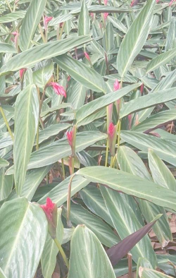 紫背竹芋(拉丁学名:Stromanthe sanguineaSond.):竹芋科,花竹芋属,多年生草本植物。株高可达80厘米,直立。叶片长卵形或披针形。它枝叶生长茂密、株形丰满,厚革质,叶面深绿色有光泽,中脉浅色,叶背血红色,形成鲜明的对比。穗状花序,苞片及萼鲜红色,花瓣白色。背部呈紫红色。紫背竹芋原产巴西。喜阴观叶植物。常用来布置卧室、客厅、办公室等场所,显得安静、庄重。