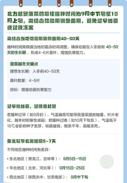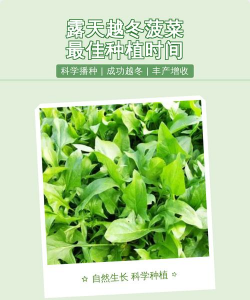 越冬菠菜一般在每年的10月中旬-11月上旬播种,具体的种植时间还需要根据当地的气候、温度作出一定的调整。越冬菠菜播种,种子在土壤中越冬,当年不发芽(播前不可催芽)次年,3月初即可陆续出苗,收获后的种株,在干燥的地方堆置几天时间,以待种子后熟,然后抢晴天让其充分干燥苗,采用此法,种子产量较低,但占地时间短。