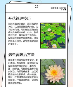 7、管理睡莲:睡莲的生长速度较快,需要定期修剪叶子和花朵,以保持睡莲的健康和美观。同时,还需要注意防治病虫害问题。